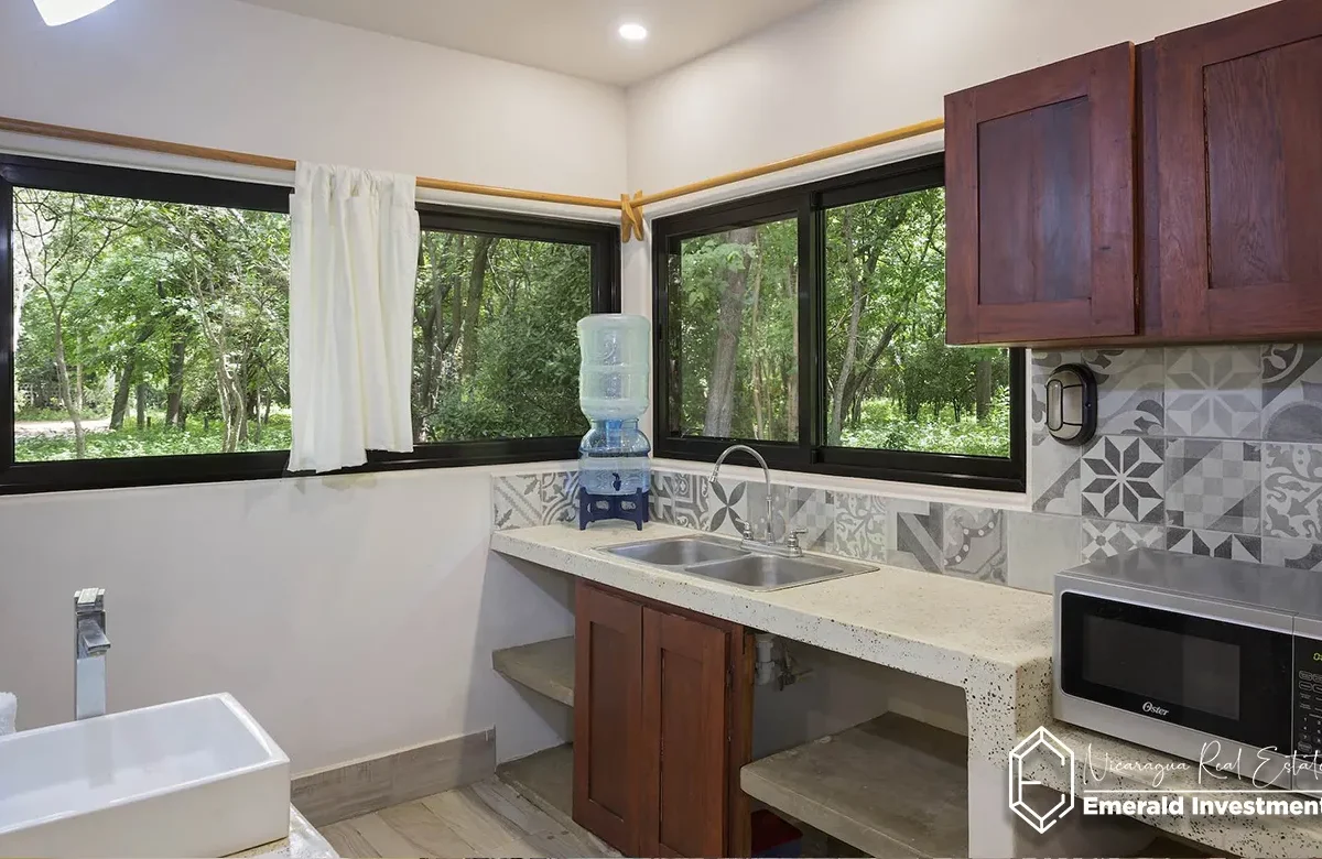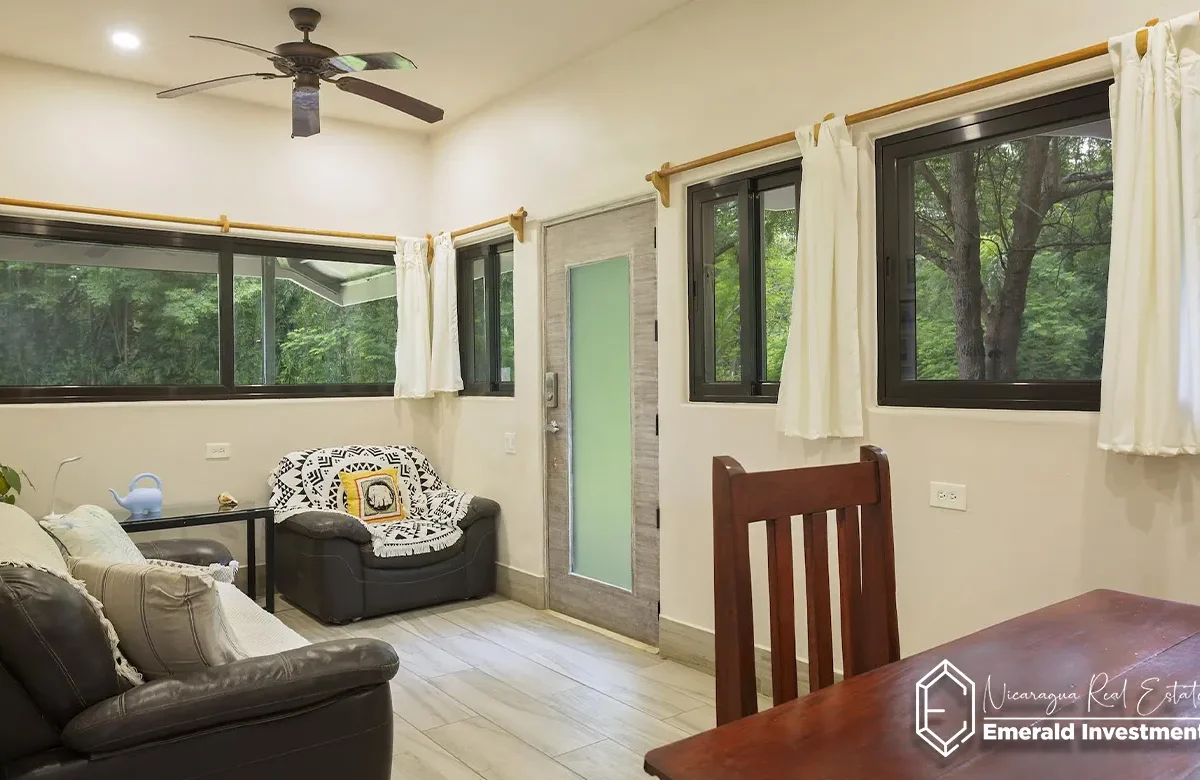 This eco-friendly property stands out with its thoughtful design, featuring large windows that bring nature indoors. These windows frame the lush woodsy views and maximize cross-breeze ventilation, ensuring a comfortable and energy-efficient living experience.