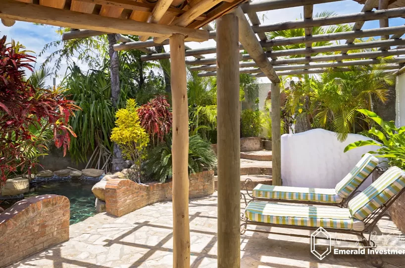 Follow a winding brick pathway to find a yoga Shala for your own private practice or large enough to accommodate a group of 10-12. Another winding brick pathway leads to a restaurant space that was built in 2021. This covered space has enough room for tables and chairs for 20 people as well as a bar area. There is also a full kitchen with plenty of food prep space. The view from the restaurant is stunning; you can see the ocean and all the way to the Christ statue overlooking the bay of San Juan del Sur.
