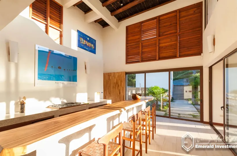 Casa Luna boasts an exceptional indoor/outdoor design. Sliding kitchen walls open onto a large ocean-view terrace with a dining area, lounge seating, and a North American-style grill, perfect for sunset meals. The fully equipped kitchen includes a gas stove, dishwasher, microwave, and ample counter space, making cooking a pleasure.