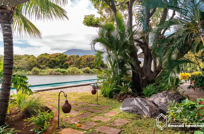 Outside, the property continues to impress. Lush tropical landscaping surrounds the home, along with mature trees and a sparkling swimming pool. Additionally, several outdoor areas invite you to relax, entertain, or simply take in the serene lake views.